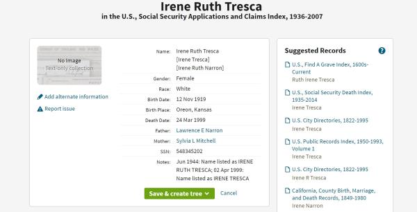 Irene Ruth Narron was born on November 12, 1919 in Kansas, USA. She and