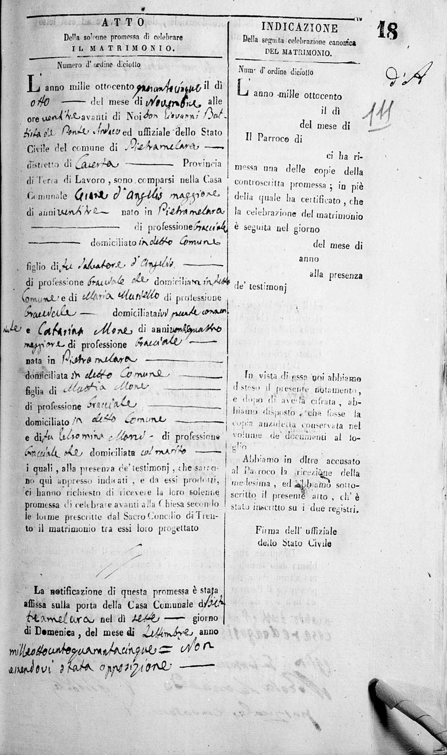 Nicola Cesare De Angelis were married on November 8, 1845 in Pietramelara, Caserta, Campania, Italy. She died.