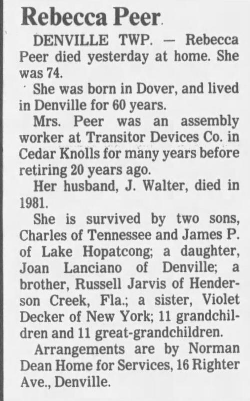 James Walter Peer were married. She died on November 1, 1992, at age ~74, in Denville, Morris, New Jersey, USA. She was buried in Denville Cemetery, Denville, New Jersey.