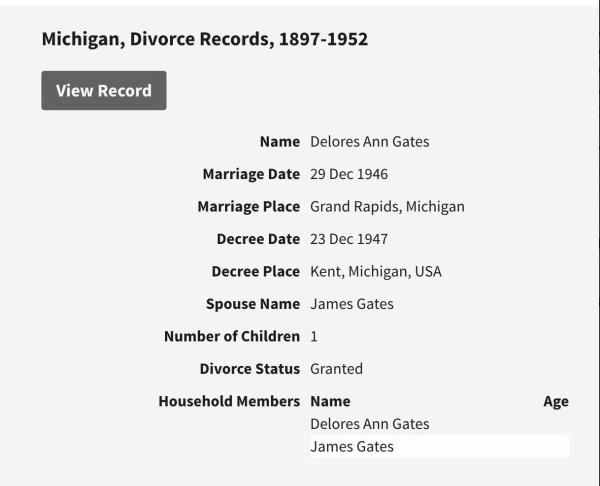 James Eugene Gates were divorced on December 23, 1947 in Kent, Michigan, USA. She and