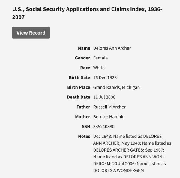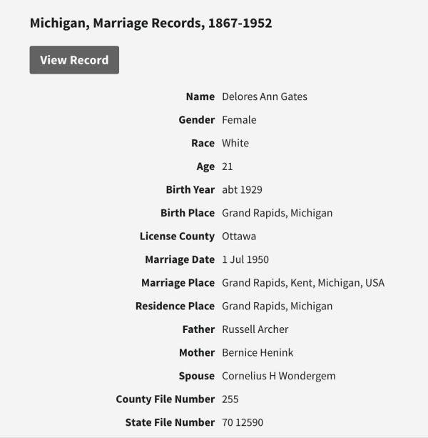 Delores Ann Archer was born on December 16, 1928 in Grand Rapids, Kent, Michigan, USA. She and