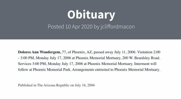 Cornelius Henry "Neil" Wondergem were married on July 1, 1950 in Grand Rapids, Kent, Michigan, USA. She died on July 11, 2006, at age 77, in Scottsdale, Maricopa, Arizona, USA. She was buried in Phoenix Memorial Park and Cemetery, Phoenix, Arizona.
