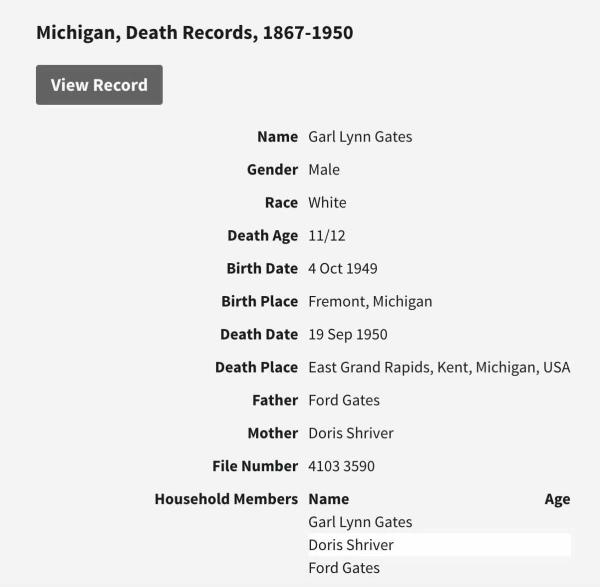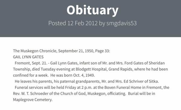 Gale Lynn Gates was born on October 4, 1949 in Fremont, Newaygo, Michigan, USA. He died on September 19, 1950, at age 0, in East Grand Rapids, Kent, Michigan, USA. He was buried in Maple Grove Cemetery, Fremont, Michigan.