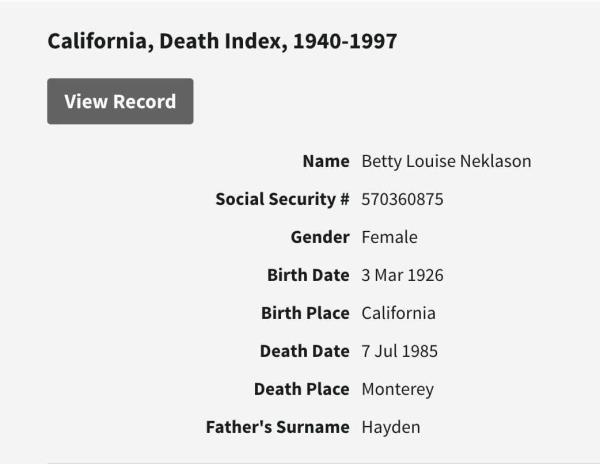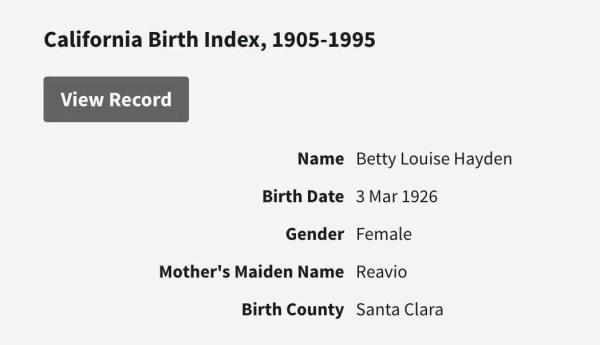 Betty Louise Hayden was born on March 3, 1926 in Santa Clara, California, USA. She and