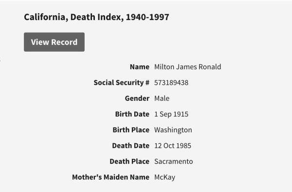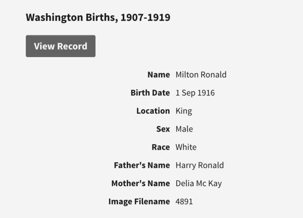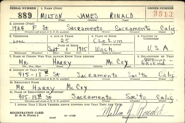Milton James Ronald was born on September 1, 1915 in Cle Elum, Kittitas, Washington, USA. He and