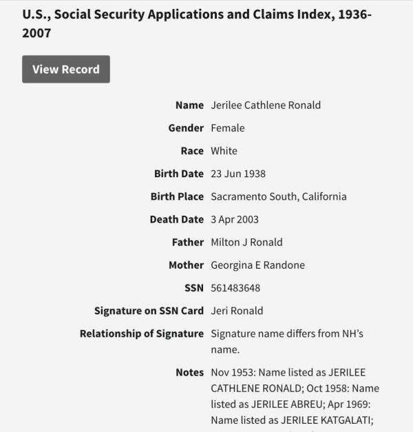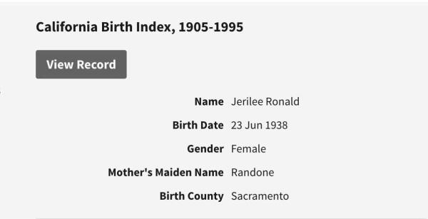 Jerilee Kathlene Ronald was born on June 23, 1938 in Sacramento South, Sacramento, California, USA. She died on April 3, 2003, at age 64, in Sacramento, Sacramento, California, USA.