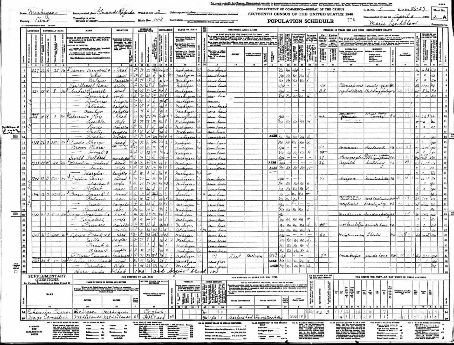 Shriver Family 1940 Federal Census Michigan, Lines 27-32