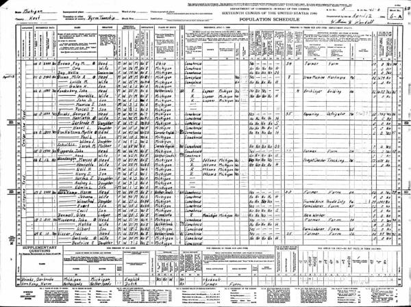 Archer Family 1930 Federal Census Michigan, Lines 1-2