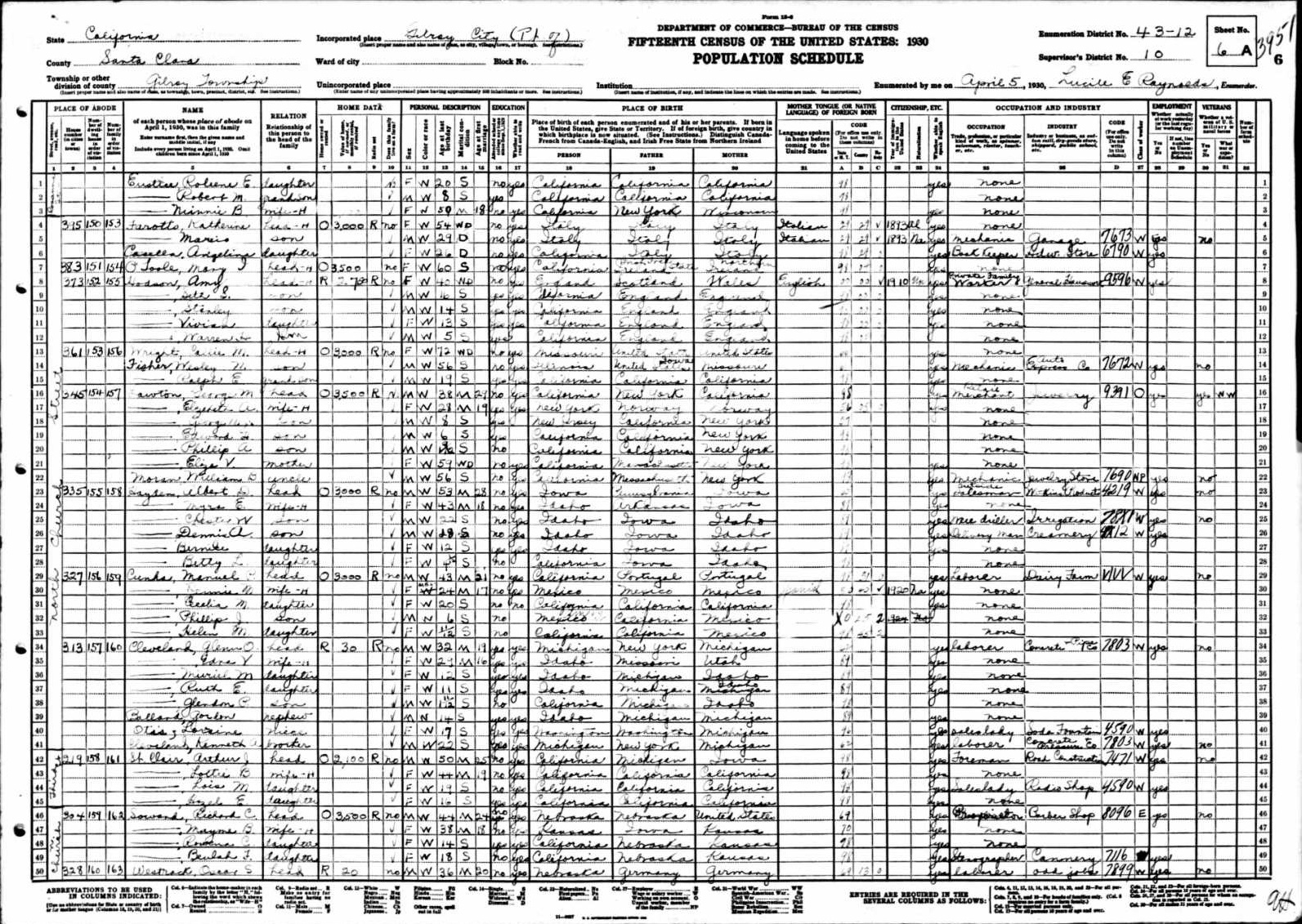 Hayden Family 1930 Federal Census California, Lines 23-38