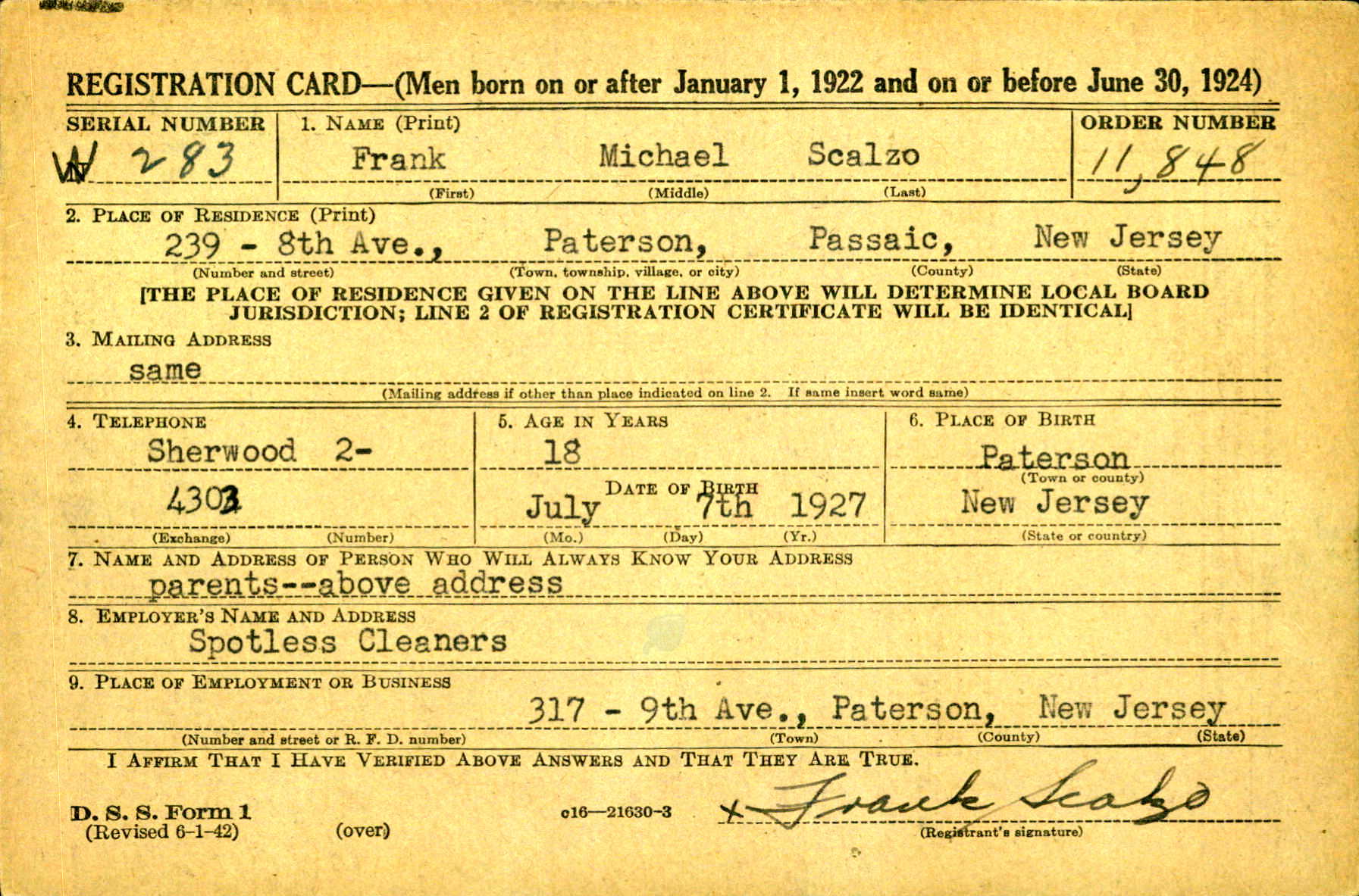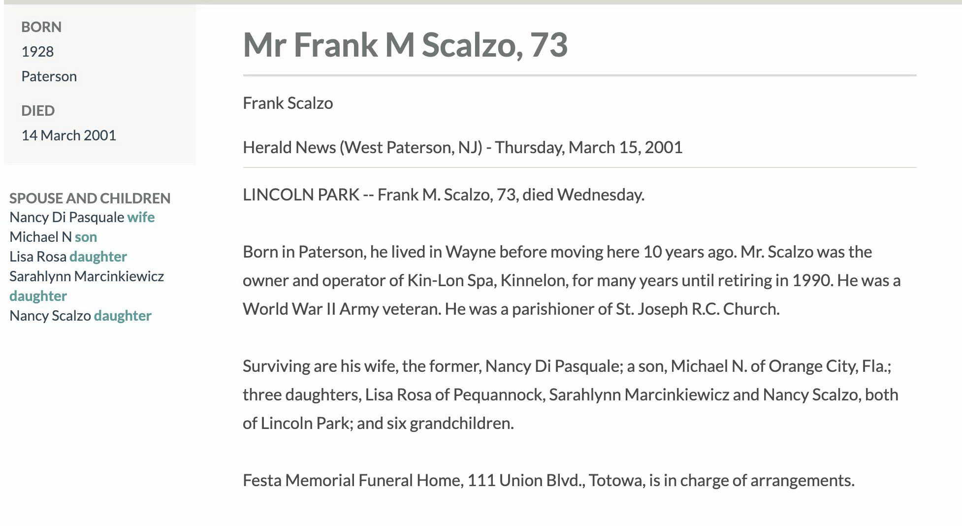 Frank Michael Scalzo was born on July 7, 1927 in Paterson, Passaic, New Jersey, USA. He and