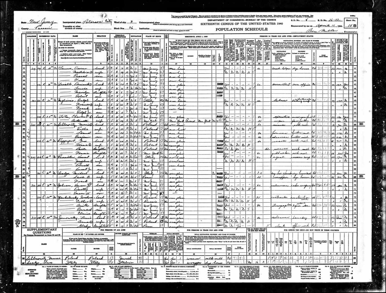 Scalzo Family 1940 Federal Census New Jersey, Lines 67-69