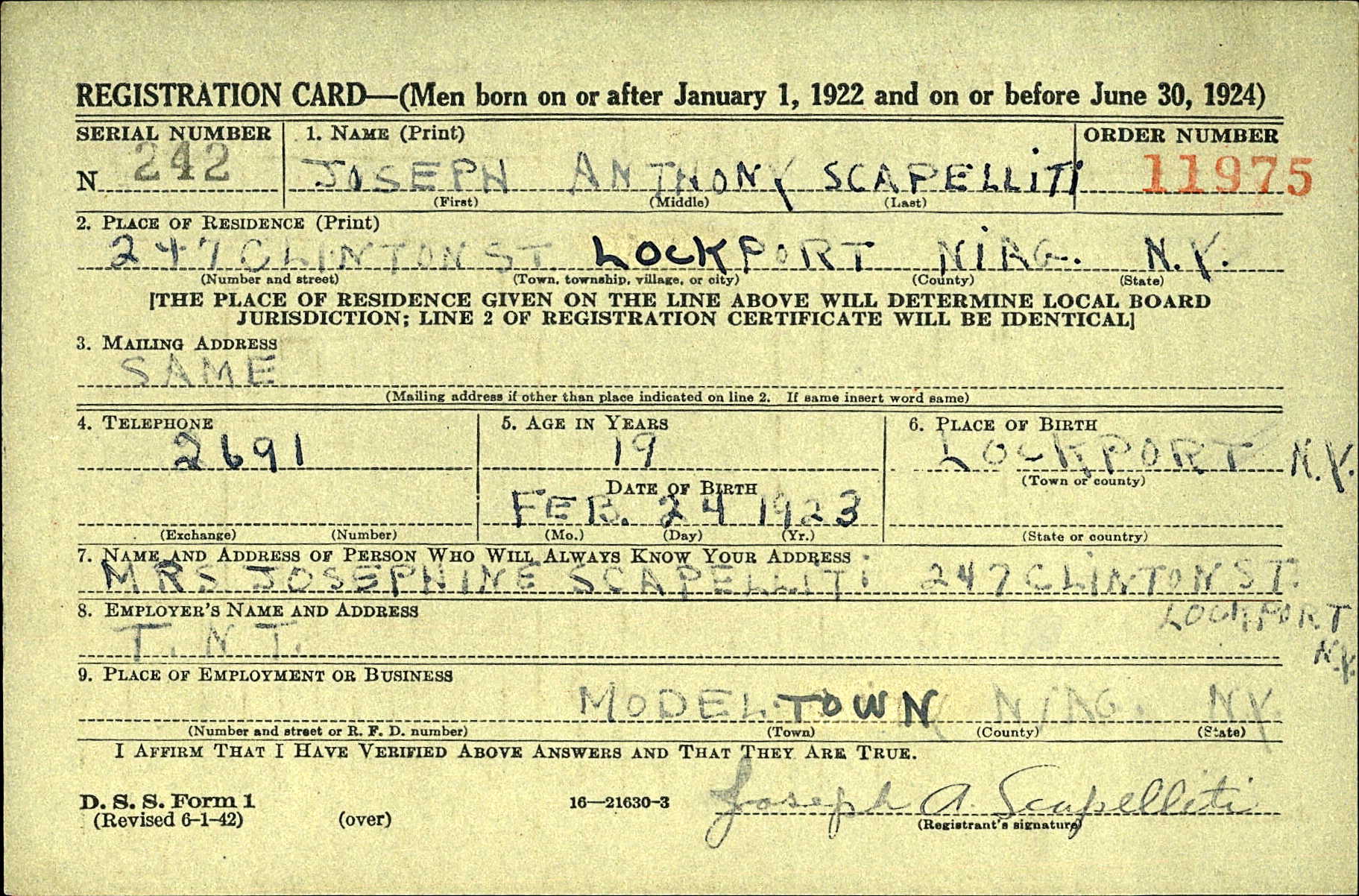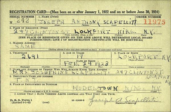 Joseph Anthony Scapelliti was born on February 24, 1923 in Lockport, Niagara, New York, USA. He and