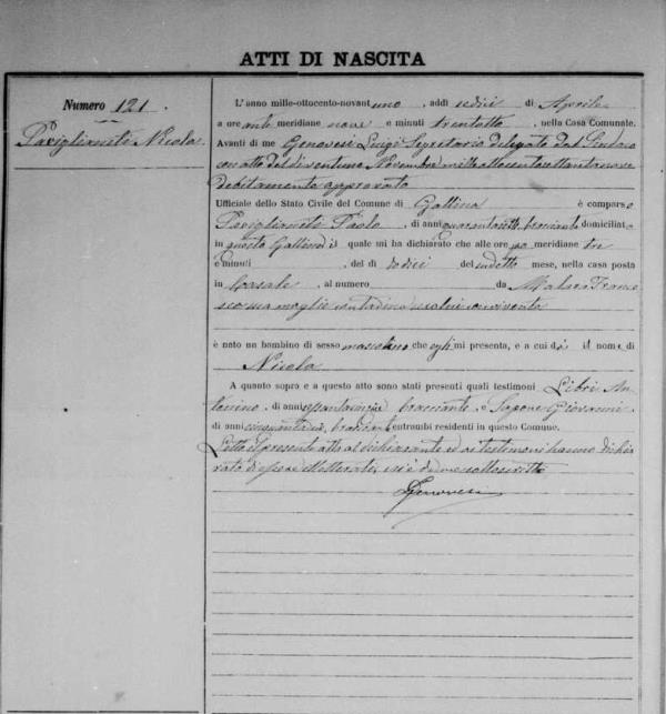 Nicola "Nicholas" Paviglianti was born on April 12, 1891 in Gallina, Reggio di Calabria, Calabria, Italy. He and
