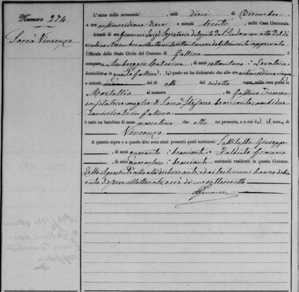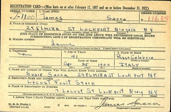 Vincenzo W. "James" Sacca was born on November 25, 1900 in Gallina, Reggio di Calabria, Calabria, Italy. He and