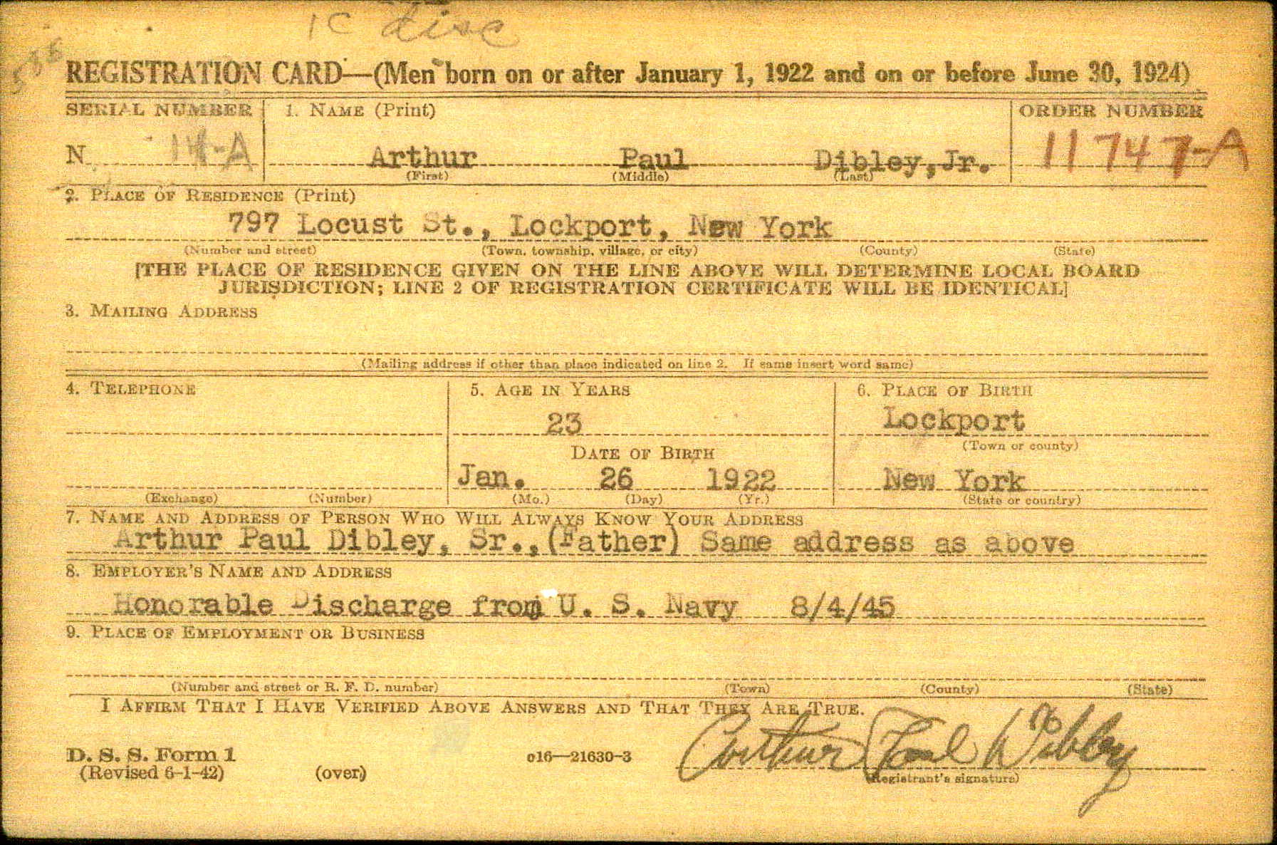 Arthur Paul Dibley, Jr., was born on January 26, 1922 in Lockport, Niagara, New York, USA. He and