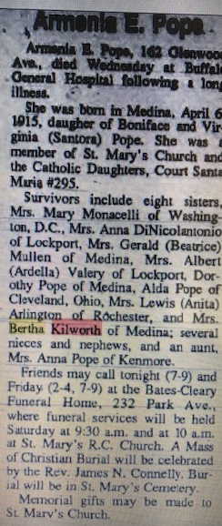 Doretta "Dorothy" Papi (Pope) was born on June 5, 1916 in Medina, Orleans, New York, USA. She died on August 20, 2003, at age 87, in Medina, Orleans, New York, USA. She was buried in Saint Mary's Cemetery, Medina, New York.