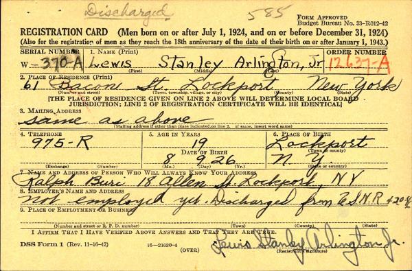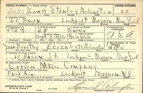 Lewis Stanley Arlington, Jr., was born on August 9, 1926 in Lockport, Niagara, New York, USA. He and