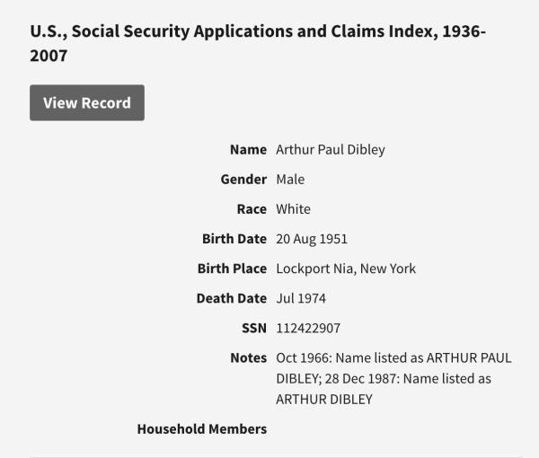Arthur Paul Dibley, III, was born on August 20, 1951 in Lockport, Niagara, New York, USA. He died in July 1974, at age 22, in Clarence, Erie, New York, USA. He was buried in Cold Springs Cemetery, Lockport, New York.