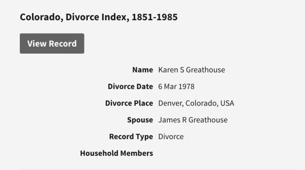 James R. Greathouse were divorced on March 6, 1978 in Denver, Colorado, USA. She and