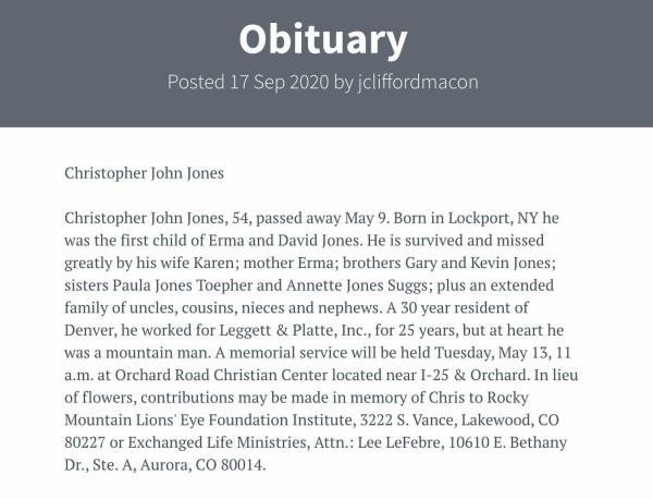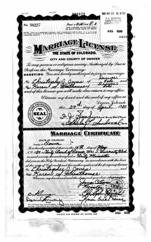 Christopher John Jones were married on May 16, 1980 in Denver, Denver, Colorado, USA. She died on June 27, 2005, at age 57, in Greenwood Village, Arapahoe, Colorado, USA.