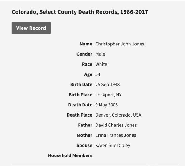 Karen Sue Dibley were married on May 16, 1980 in Denver, Denver, Colorado, USA. He died on May 9, 2003, at age 54, in Denver, Denver, Colorado, USA.
