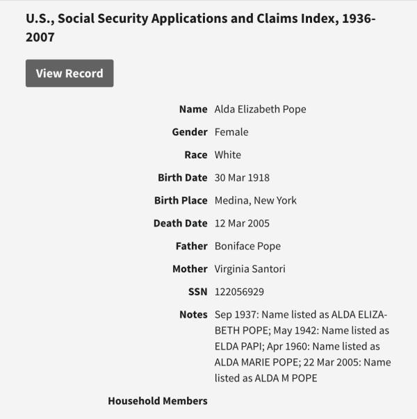 Alda Elizabeth Marie Papi (Pope) was born on March 30, 1918 in Medina, Orleans, New York, USA. She died on March 12, 2005, at age 86, in Lehighton, Carbon, Pennsylvania, USA. She was buried in Holy Cross Cemetery, Brook Park, Ohio.