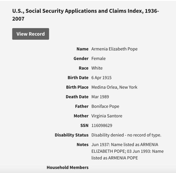 Armenia Elizabeth Papi (Pope) was born on April 6, 1915 in Medina, Orleans, New York, USA. She died on March 8, 1989, at age 73, in Medina, Orleans, New York, USA. She was buried in Saint Mary's Cemetery, Medina, New York.