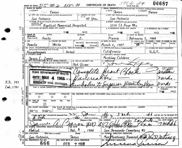 Pierce were married. She died on February 5, 1966, at age 58, in San Antonio, Bexar, Texas, USA. She was buried in San Fernando Cemetery #2, San Antonio, Texas.