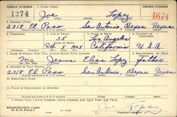 Jose "Joshua" Lopez was born on February 5, 1905 in Los Angeles, California, USA. He died in 1995, at age ~90. He was buried in San Fernando Cemetery #2, San Antonio, Texas.