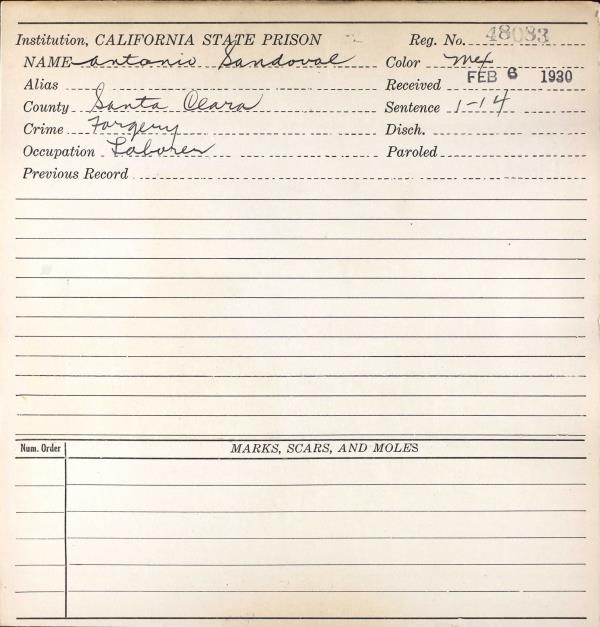 Antonio Sandoval 1930 Federal Census San Quentin Prison California, Line 87