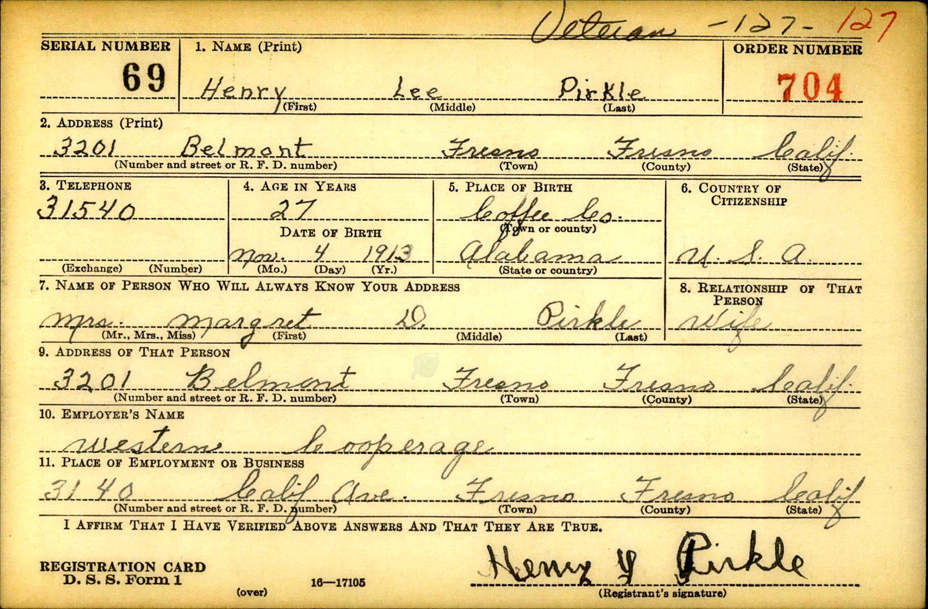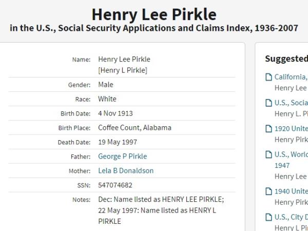 Henry Lee Pirkle was born on November 4, 1913 in Coffee, Alabama, USA. He and