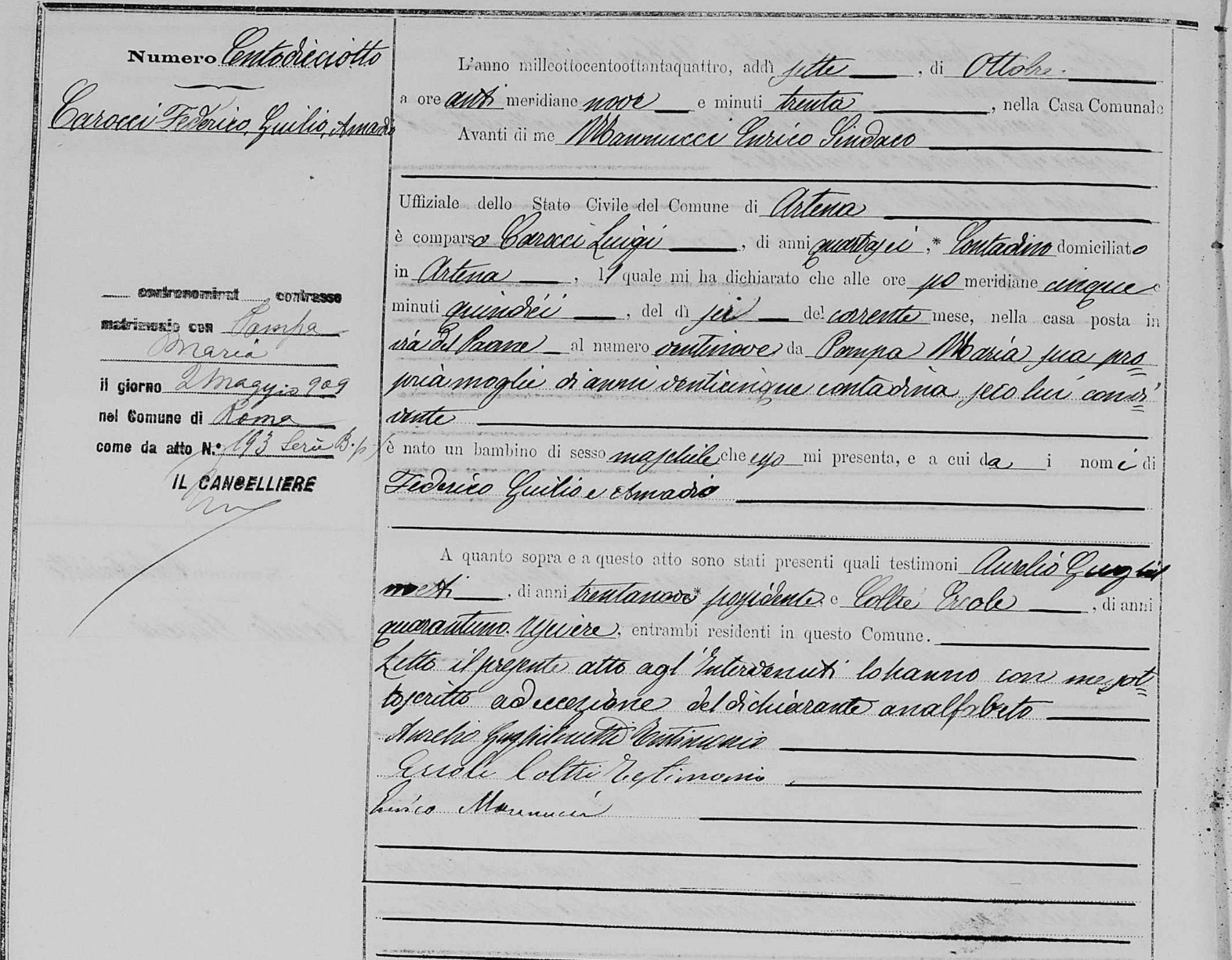 Federico Guilio Amadio Carocci was born on October 6, 1884 in Artena, Roma, Lazio, Italy. He and