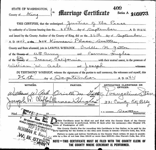 Carmelita Isabelle "Carmen" Hughes were married on September 26, 1944 in Seattle, King, Washington, USA. He died on December 11, 2008, at age 89, in Maitland, Orange, Florida, USA. He was buried in Glen Haven Memorial Park and Mausoleum, Winter Park, Florida.