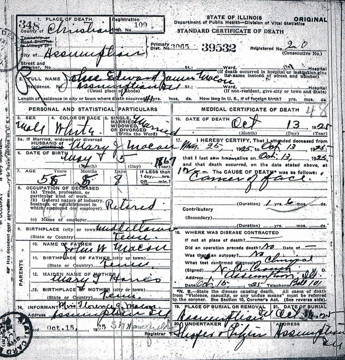 Mary Jane Jones were married on October 26, 1904 in Christian, Illinois, USA. He died on October 13, 1925, at age 57, in Assumption, Christian, Illinois, USA. He was buried in Greenwood Cemetery, Assumption, Illinois.