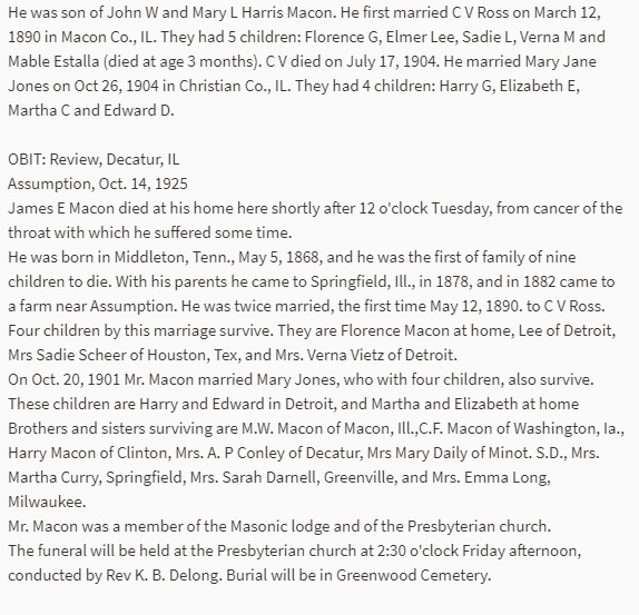 John Edward Macon were married on October 26, 1904 in Christian, Illinois, USA. She died in 1942, at age ~69.