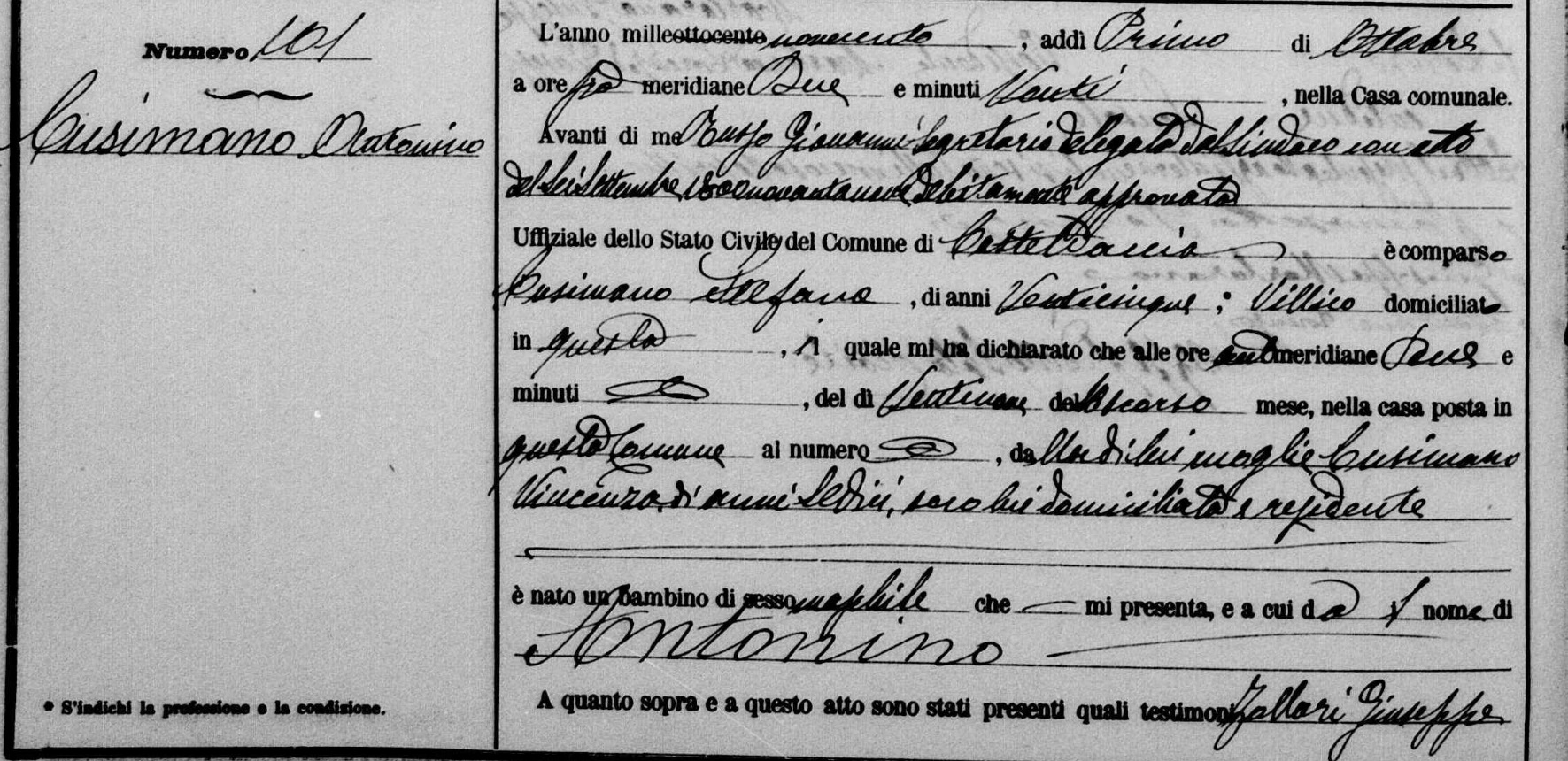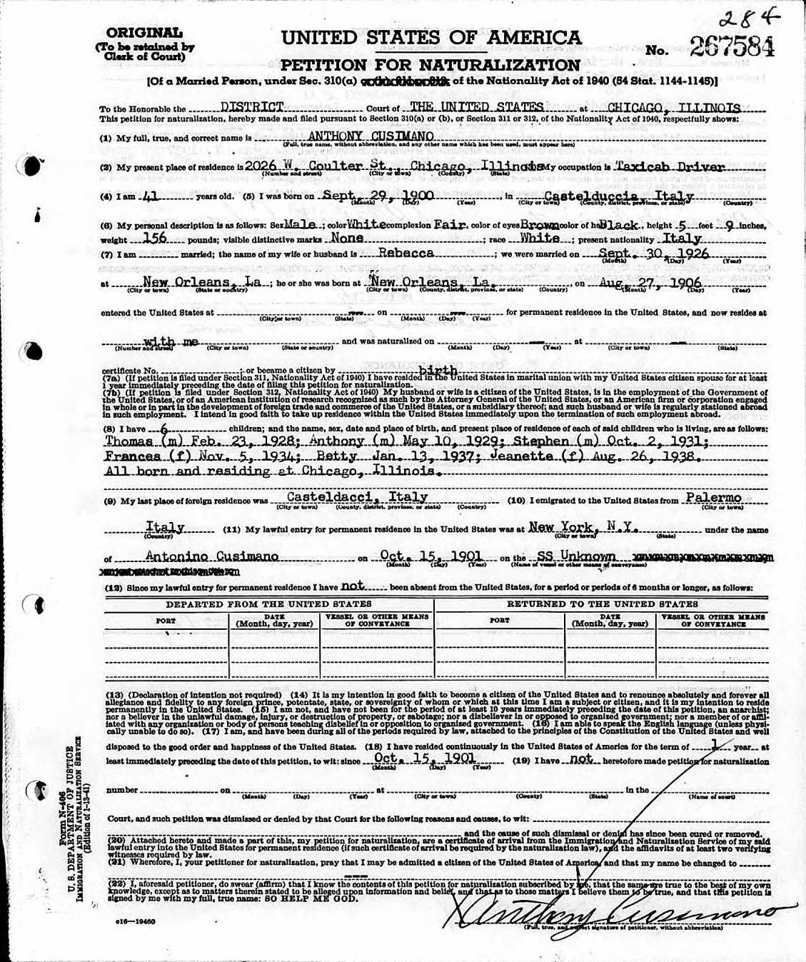 Antonino Cusimano was born on October 29, 1900 in Casteldaccia, Palermo, Sicily, Italy. He and