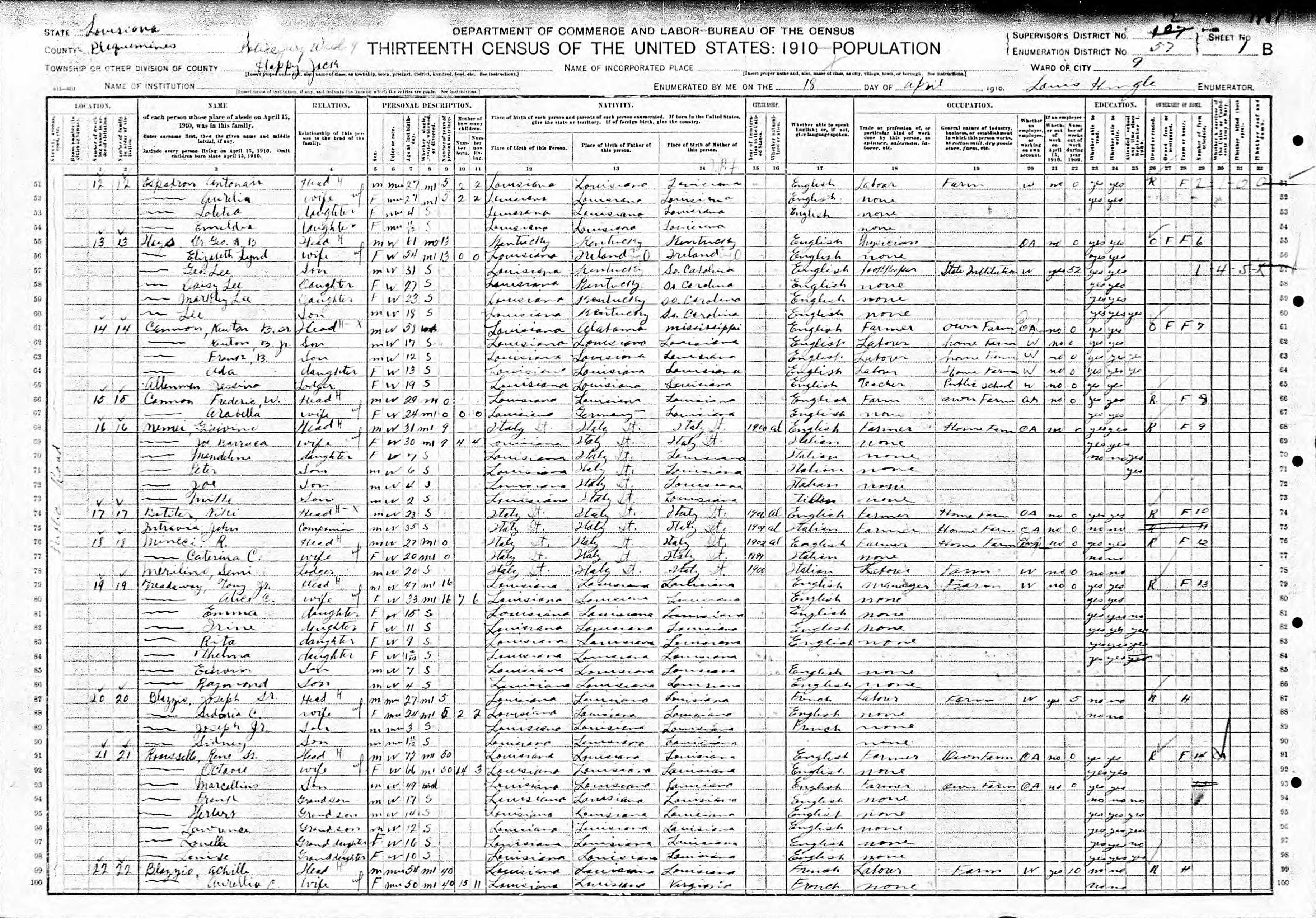 Cusimano Family 1910 Federal Census Louisiana, Lines 72-77