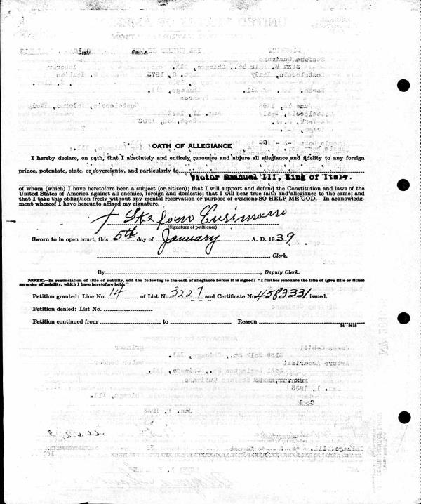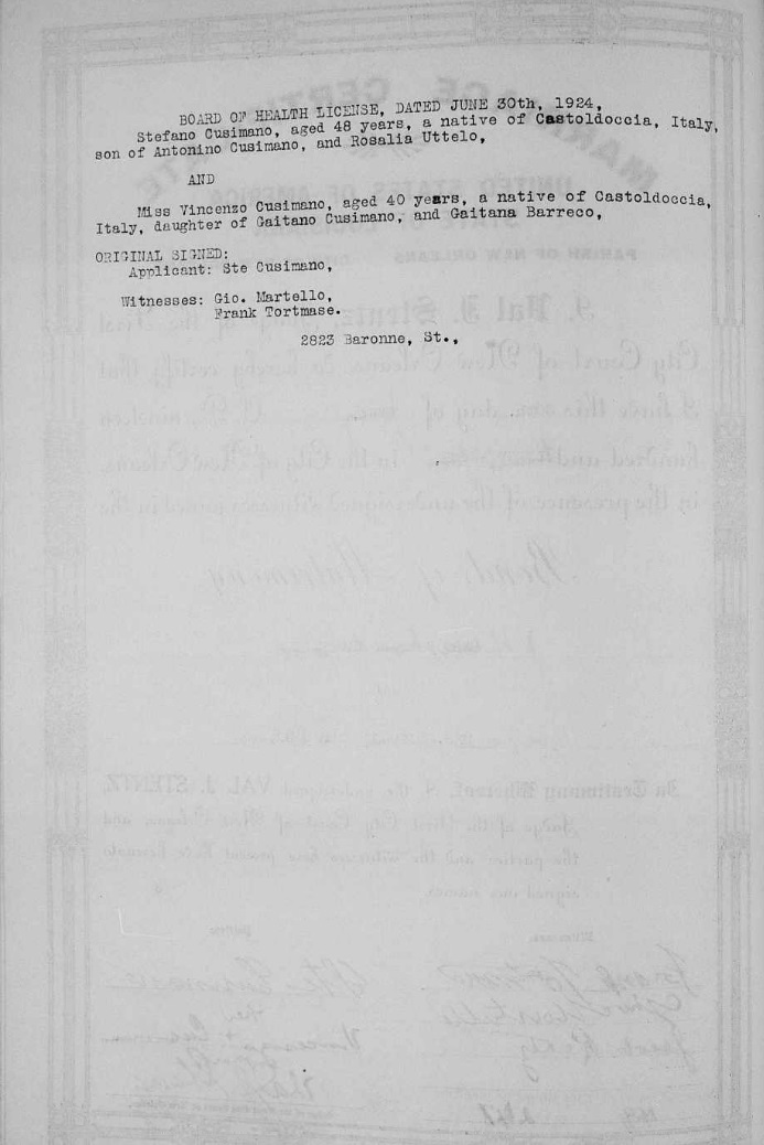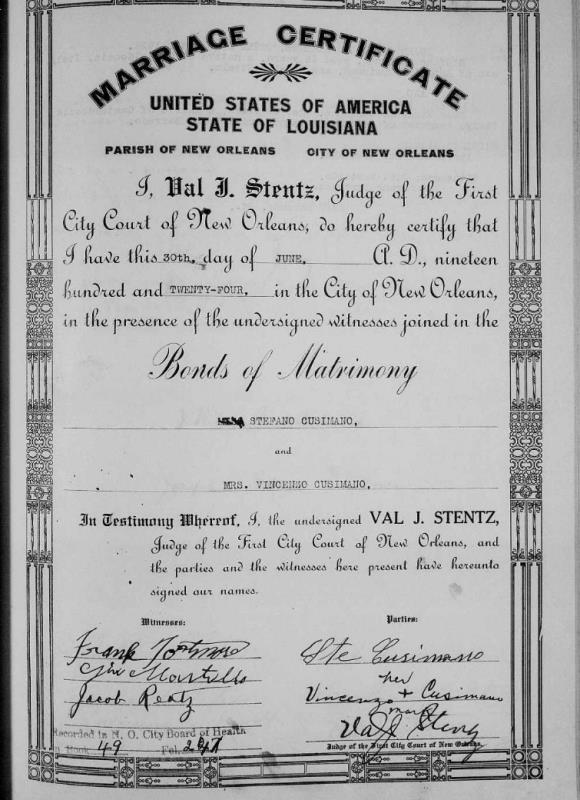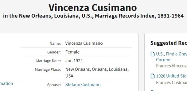 Vincenza "Frances" Cusimano were married on June 30, 1924 in New Orleans, Louisiana, USA. He died on August 14, 1949, at age 73, in Chicago, Cook, Illinois, USA. He was buried in Elmwood Cemetery and Mausoleum, River Grove, Illinois.