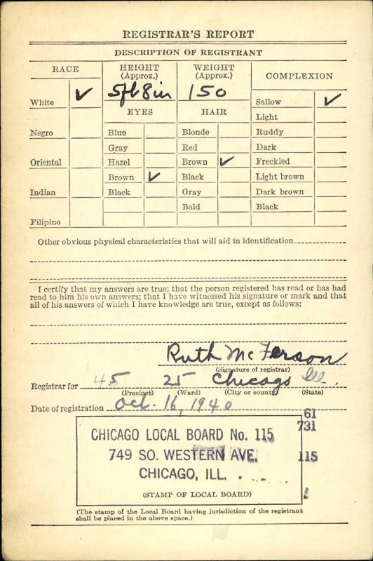 Vittoria A. were married. He died in 1995, at age ~84. He was buried in Elmwood Cemetery and Mausoleum, River Grove, Illinois.