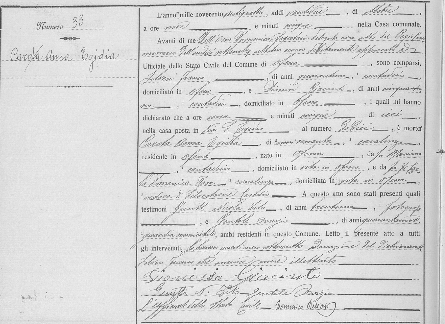 Consiglia Carota were married. He died on September 27, 1936, at age ~73, in Ofena, L'Aquila, Abruzzo, Italy.