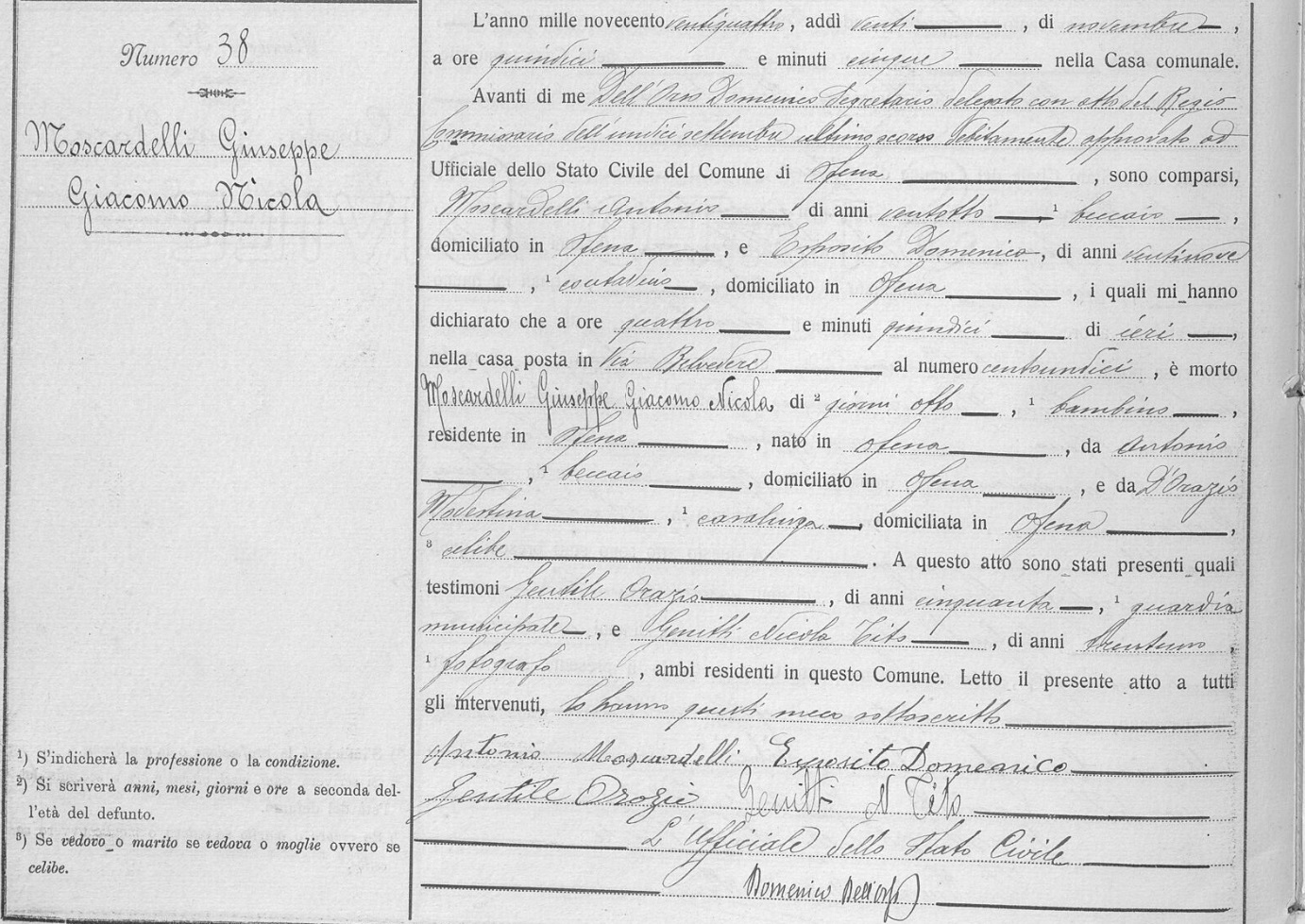 Giuseppe Giacomo Nicola Moscardelli was born on November 11, 1924 in Ofena, L'Aquila, Abruzzo, Italy. He died on November 19, 1924, at age 0, in Ofena, L'Aquila, Abruzzo, Italy.