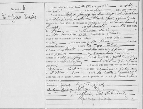 Pietro Di Marco was born in 1857 in Ofena, L'Aquila, Abruzzo, Italy. He died on October 8, 1937, at age ~80, in Ofena, L'Aquila, Abruzzo, Italy.