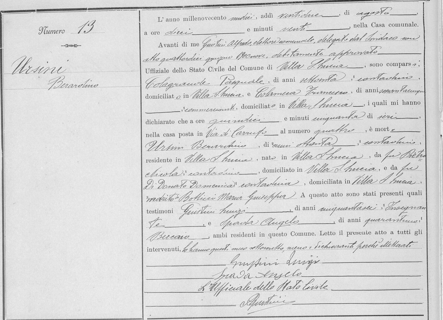 Domenico Ursini were married. She died on April 20, 1918, at age ~62, in Villa Santa Lucia Degli Abruzzi, L'Aquila, Abruzzo, Italy.