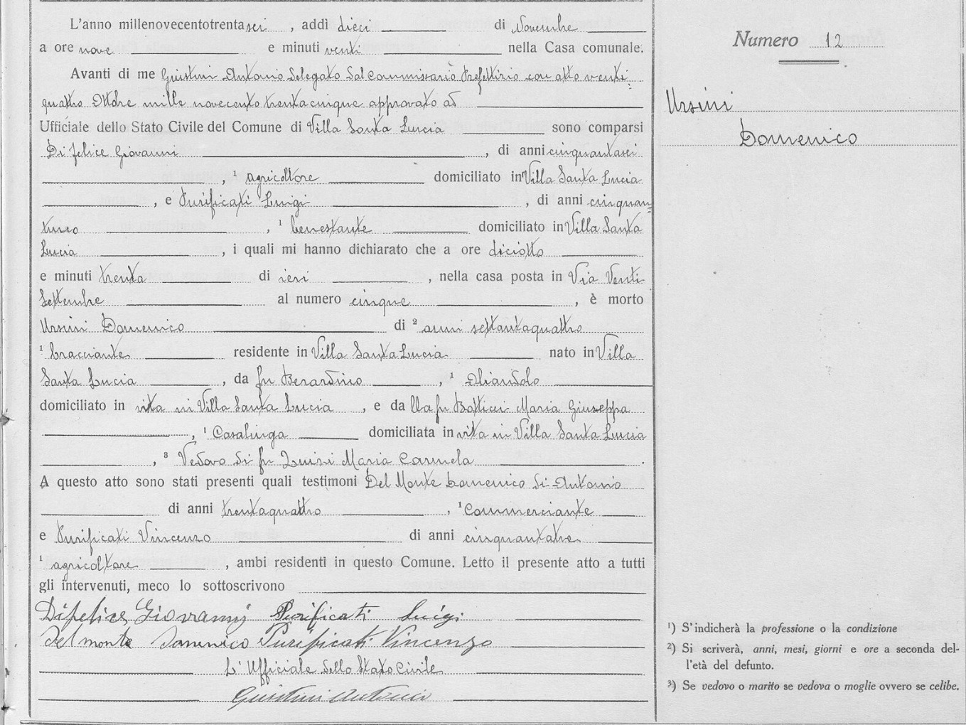 Maria Carmela Quizi were married. He died on November 9, 1936, at age ~74, in Villa Santa Lucia Degli Abruzzi, L'Aquila, Abruzzo, Italy.