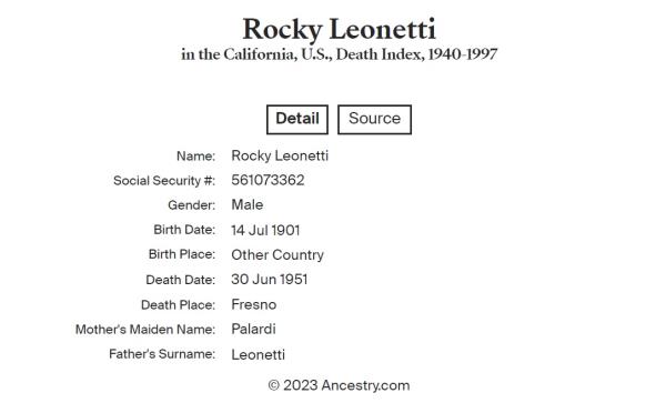 Rocco "Rocky" Leonetti was born on July 14, 1901 in Castro dei Volsci, Frosinone, Lazio, Italy. He and