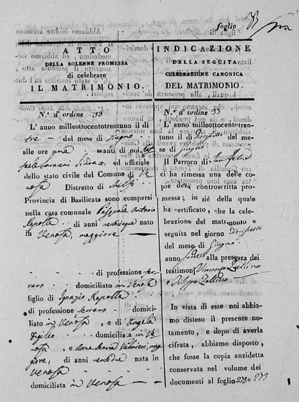 Pasquale Antonio Rapolla were married on July 17, 1831 in Venosa, Potenza, Basilicata, Italy. She died.