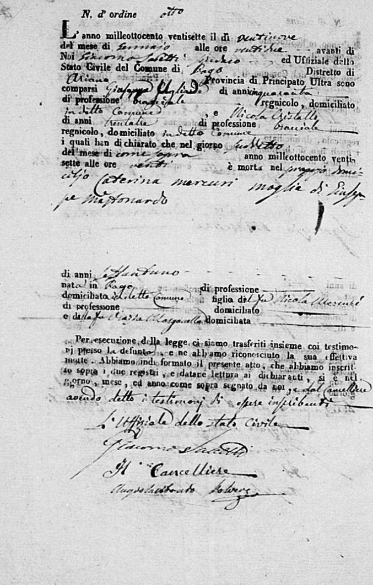 Antonia Mastronardi were married on May 27, 1812 in Pago Veiano, Benevento, Campania, Italy. He died on September 25, 1837, at age ~47, in Pago Veiano, Benevento, Campania, Italy.