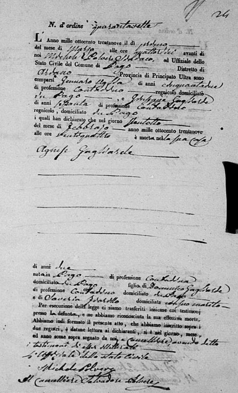 Agnese Gagliardi was born in 1837 in Pago Veiano, Benevento, Campania, Italy. She died on February 28, 1839, at age ~2, in Pago Veiano, Benevento, Campania, Italy.