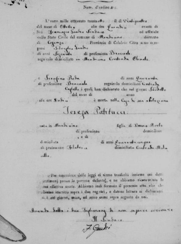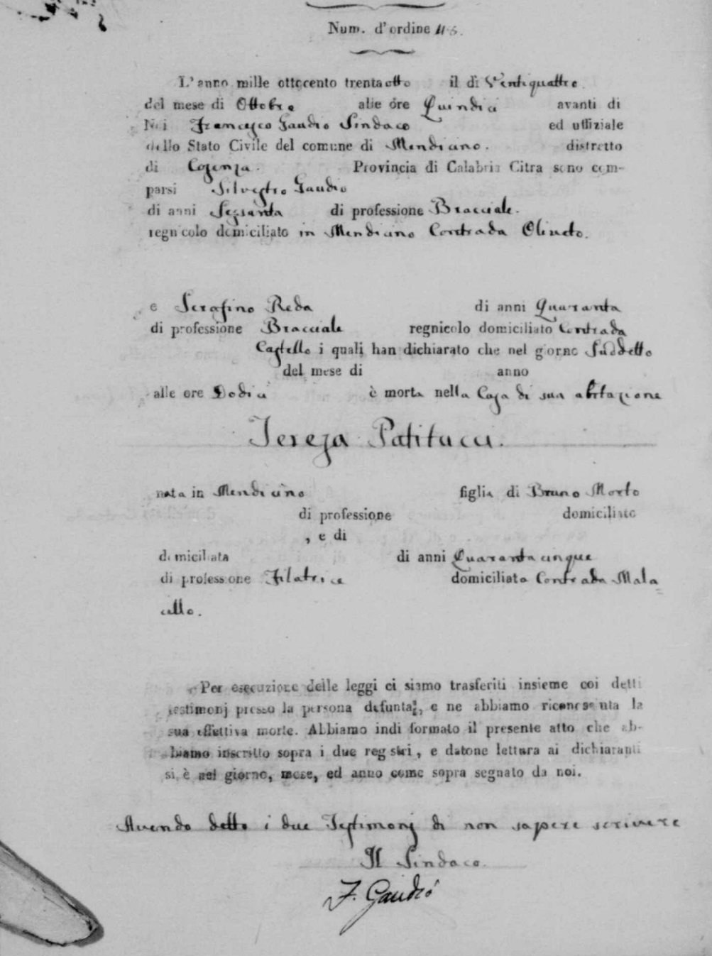 Teresia Patitucci was born in 1791 in Mendicino, Cosenza, Calabria, Italy. She and