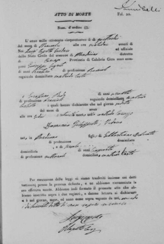 Areangela Reda were married on October 16, 1834 in Mendicino, Cosenza, Calabria, Italy. He died in Italy.